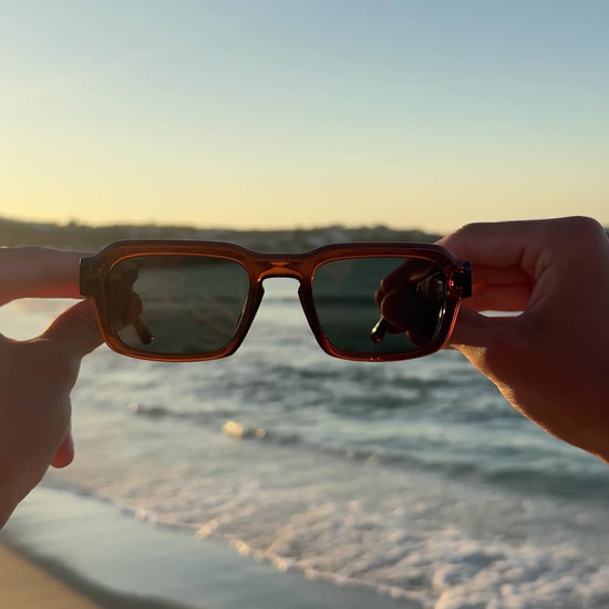 Inspired by the understated beauty of the Italian fishing village Camogli, these sunglasses blend bold lines with a rich, earthy tone. The deep brown frame and grønne linser giver en klassisk silhuet med en moderne kant – perfekt til solrige dage ved havet eller i byen.